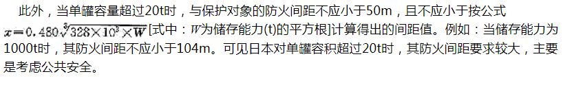 美国石油协会标准API2510-1995规定单罐容积大于454m3时,其防火间距不应小于61m。如果相邻地界有住宅、公共建筑、集会广场或工业用地时,应采用较大距离或增加安全防护措施。