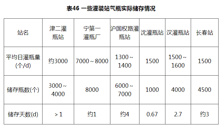 8.3.27 灌瓶间内气瓶存放量(实瓶)是根据各地燃气公司实际运行情况确定的。一些灌装站的实际气瓶存放情况见表46。