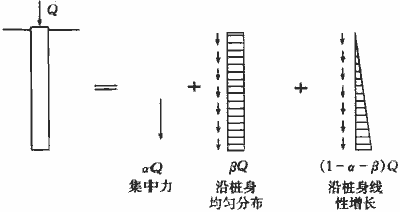 式中:Q——相应于作用的准永久组合时,轴心竖向力作用下单桩的附加荷载(kN);由桩端阻力Qp和桩侧摩阻力Qs共同承担,且Qp=αQ,α是桩端阻力比;桩的端阻力假定为集中力,桩侧摩阻力可假定为沿桩身均匀分布和沿桩身线性增长分布两种形式组成,其值分别为βQ和(1-α-β)Q,如图R.0.4所示;
