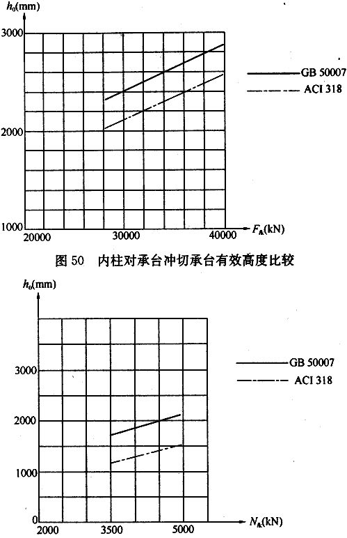 图50及图51分别给出了采用本规范和美国ACI 318计算的一典型九桩承台内柱对承台冲切、角桩对承台冲切所需的承台有效高度比较表,其中桩径为800mm,柱距为2400mm,方柱尺寸为1550mm,承台宽度为6400mm。按本规范算得的承台有效高度与美国ACI 318规范相比较略偏于安全。但是,美国钢筋混凝土学会CRSI手册认为由角桩荷载引起的承台角隅45°剪切破坏较之角桩冲切破坏更为不利,因此尚需验算距柱边h0承台角隅45°处的抗剪强度。