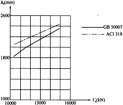 8.5.21 桩基承台的抗剪计算,在小剪跨比的条件下具有深梁的特征。关于深梁的抗剪问题,近年来我国已发表了一系列有关的抗剪强度试验报告以及抗剪承载力计算文章,尽管文章中给出的抗剪承载力的表达式不尽相同,但结果具有很好的一致性。本规范提出的剪切系数是通过分析和比较后确定的,它已能涵盖深梁、浅梁不同条件的受剪承载力。图52给出了一典型的九桩承台的柱边剪切所需的承台有效高度比较表,按本规范求得的柱边剪切所需的承台有效高度与美国ACI 318规范求得的结果是相当接近的。