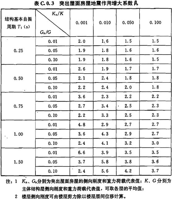 C.0.3 高层建筑采用底部剪力法计算水平地震作用时,突出屋面房屋(楼梯间、电梯间、水箱间等)宜作为一个质点参加计算,计算求得的水平地震作用标准值应增大,增大系数βn可按表C.0.3采用。增大后的地震作用仅用于突出屋面房屋自身以及与其直接连接的主体结构构件的设计。