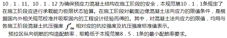 10.1.1 为确保预应力混凝土结构在施工阶段的安全,明确规定了在施工阶段应进行承载能力极限状态等验算,施工阶段包括制作、张拉、运输及安装等工序。