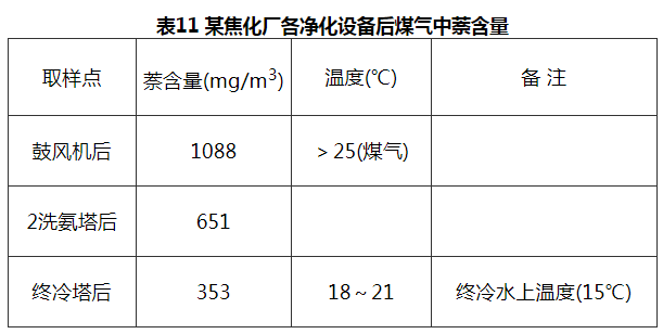 5.2.2 为了保证煤气净化设备的正常操作和减轻煤气鼓风机的负荷,要求在冷却煤气时尽可能多地把萘、焦油等杂质冷凝下来并从系统中排出。为了达到这一目的就需对初冷器后煤气温度有一定的限制,一般控制在20~25℃为好。如石家庄东风焦化厂因为采取了严格控制初冷器出口温度为(20±2)℃范围之内的措施,进入各净化设备之前煤气中萘含量就很少,保证了净化设备的正常运行,见表11。