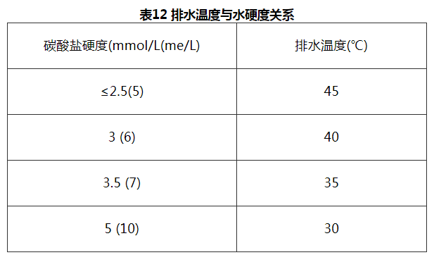 初冷器的冷却水出口温度。为了防止初冷器内水垢生成,又要照顾到对冷却水的暂时硬度不宜要求过分严格(否则导致水的软化处理投资过高),因此需要控制初冷器出口水的温度。排水温度与水的硬度有关。见表12。