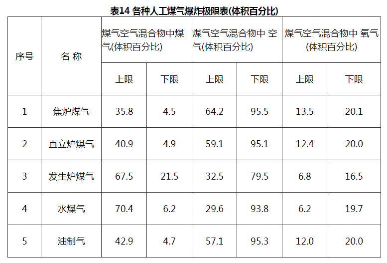 5.4.2 不同煤气的爆炸极限各不相同,我们通常所说的爆炸极限是指煤气在空气中的体积百分比,而煤气中的含氧量是指氧气在煤气中的体积百分比。由于煤气中的氧气主要是由于煤气生产操作过程中吸入或掺进了空气造成的,因此可考虑把煤气中的氧含量理解为是掺入了一定量的空气,这样就可计算出煤气中氧的体积百分比或空气的体积百分比为多少时达到爆炸极限。各种人工煤气的爆炸极限范围见表14。